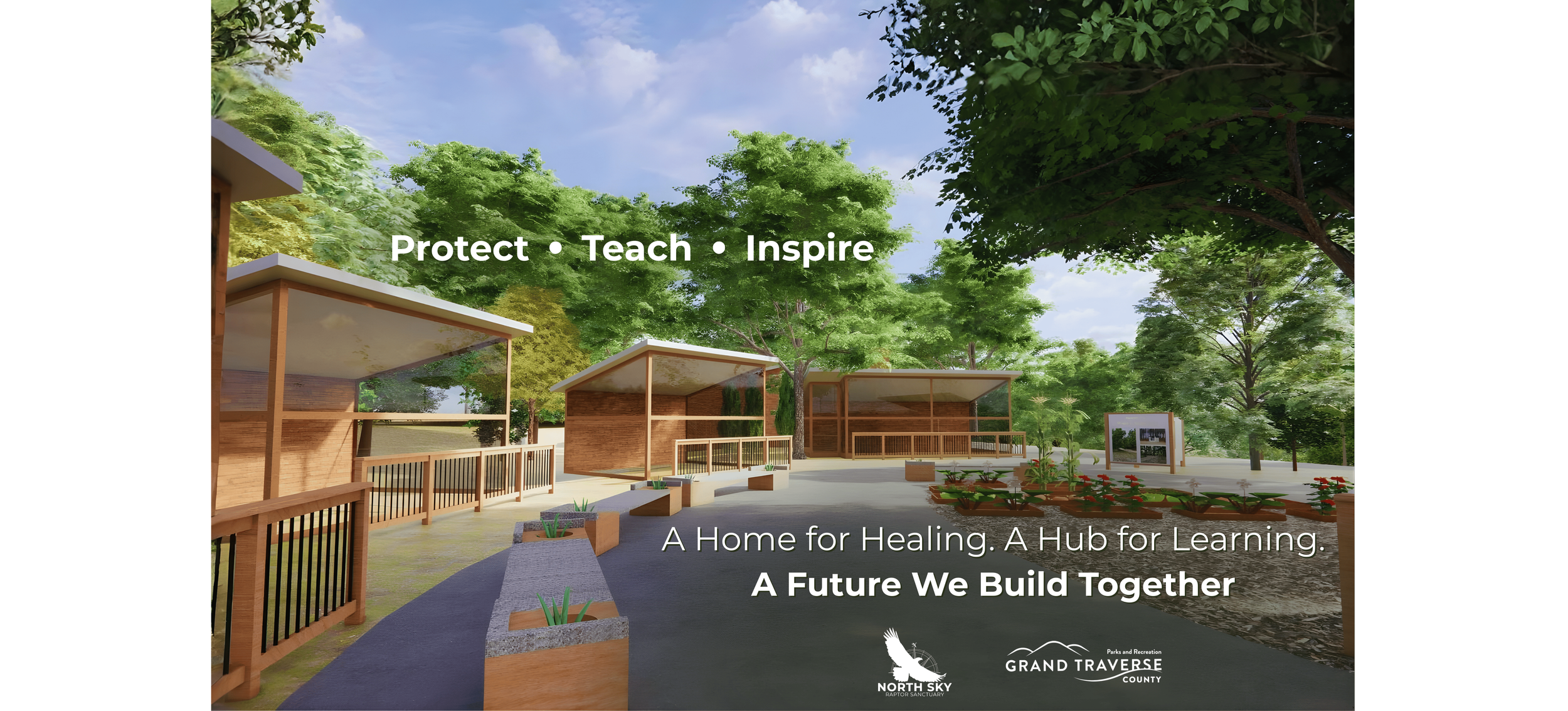 North Sky Raptor Sanctuary aims to bring immersive experiential wildlife education to YOUR backyard! This two acre property will include a 4500 sq. ft. bird of prey hospital and public raptor center (the first of its kind in Northern Michigan), and will feature an outdoor interpretive trail showcasing ten species of non-releasable ambassador raptors, as well as a 5000 sq. ft. reconditioning flight enclosure to serve as a recovery space for raptor patients prior to their healthy release back to the wild. This innovative campus will be rooted in the heart of Grand Traverse County’s newest public park, Camp Greilick, located in East Bay Township.
